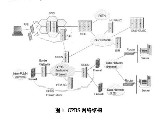 GPRS(GeneralPacketRadioService.通用無(wú)線(xiàn)分組業(yè)務(wù))作為第二代移動(dòng)通信技術(shù)GSM向第三代移動(dòng)通信(3G)的過(guò)渡技術(shù),是一種基于GSM的移動(dòng)分組數(shù)據(jù)業(yè)務(wù),面向用戶(hù)提供移動(dòng)分組的IP或者X.25連接。GPRS在現(xiàn)有的GSM網(wǎng)絡(luò)基礎(chǔ)上疊加了一個(gè)新的網(wǎng)絡(luò).同時(shí)在網(wǎng)絡(luò)上增加一些硬件設(shè)備和軟件升級(jí)。形成了一個(gè)新的網(wǎng)絡(luò)邏輯實(shí)體,提供端點(diǎn)到端點(diǎn)的、廣域的無(wú)線(xiàn)IP連接。GPRS是一項(xiàng)高速數(shù)據(jù)處理的技術(shù)。它以分組交換技術(shù)為基礎(chǔ),用戶(hù)通過(guò)GPRS可以在移動(dòng)狀態(tài)下使用各種高速數(shù)據(jù)業(yè)務(wù),包括收發(fā)E—mail、進(jìn)行Internet瀏覽等。GPRS采用分組交換技術(shù),每個(gè)用戶(hù)可同時(shí)占用多個(gè)無(wú)線(xiàn)信道,同一無(wú)線(xiàn)信通過(guò)各種網(wǎng)關(guān)和路由到數(shù)據(jù)中心(如圖2所示)。道又可以由多個(gè)用戶(hù)共享。資源被有效的利用。使用GPRS,數(shù)據(jù)實(shí)現(xiàn)分組發(fā)送和接收,用戶(hù)永遠(yuǎn)在線(xiàn)且按流量、時(shí)間計(jì)費(fèi),迅速降低了服務(wù)成本。GPRS網(wǎng)絡(luò)結(jié)構(gòu)如圖1。