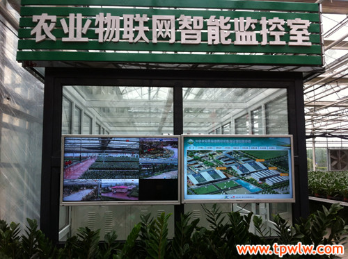 記者:所謂物聯網,其實簡單的說就是物物相連,互相感知。大家看我身后的一組探頭(托普儀器固定式無線農業氣象綜合監測站),包括這個是測量溫度的,這個是測量土壤墑情的,上面還有測量二氧化碳濃度的,測量光照強度的。那這些測量數據都會上傳到我身后的中央控制室內的計算機里,通過計算機的計算,再控制風扇、噴灌…這些設備的運轉。