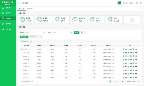 另外,平臺(tái)還對(duì)相關(guān)的反饋信息進(jìn)行了分類,有利于管理者進(jìn)行統(tǒng)一處理,提升響應(yīng)效率與資源綜合利用率。春耕備耕PC端管理平臺(tái)-反饋管理(效果圖)