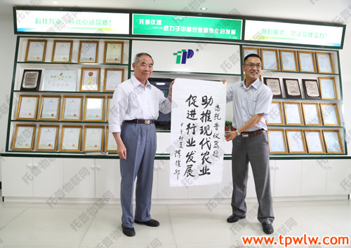 圖為:陳部長為托普儀器題下十二字勉勵之語:助推現代農業,促進行業發展