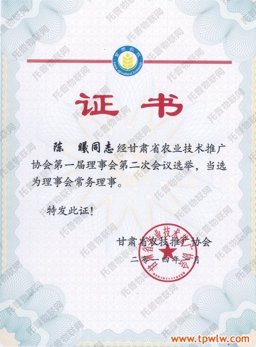 圖為:托普儀器陳曦經理任甘肅省農業技術推廣協會常務理事證書
