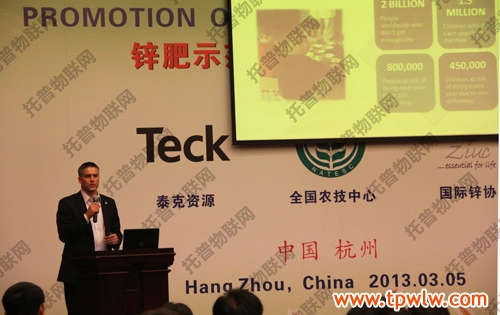 在上午的鋅肥示范推廣技術培訓與研討會上,會議邀請了國際專家加拿大泰克資源安德魯·格林教授、國際鋅協會樊明憲教授、國內專家浙江大學副教授馮英、天津市土壤肥料工作站鄭育鎖科長講解了鋅肥技術以及鋅肥在中國農業生產中試驗示范研究結果。據國際鋅協會報道,全球種植谷物的土地中有50%存在缺鋅的潛在危險、而我國土壤普遍缺鋅。農作物缺鋅主要與干旱缺水、鹽堿、漬澇等農田環境有關,科學施用鋅肥是解決農業缺鋅問題的主要途徑。近年來,隨著節水農業的不斷發展,水肥一體化逐漸成為新的鋅肥科學施用方式。科學施用鋅肥,能夠提高作物產量,改善農產品品質。為促進鋅肥的科學施用,廣泛宣傳鋅對作物生產和人體健康的作用,全國農技推廣中心與國際鋅協會、加拿大泰克資源合作開展鋅肥示范推廣工作,并大力培養應用技術人才、開展田間技術指導。