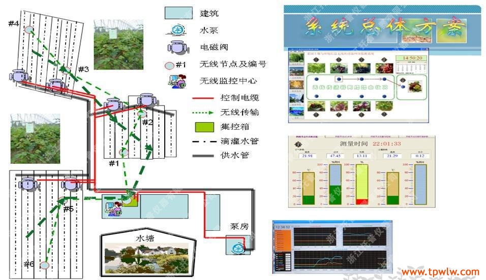 在農業園區內實現自動信息檢測與控制,通過配備無線傳感節點,太陽能供電系統、信息采集和信息路由設備、配備無線傳感傳輸具系統,每個基點配置無線傳感節點,每個無線傳感節點可監測土壤水分、土壤溫度、空氣溫度、空氣濕度、光照強度、植物養分含量等參數。其它參數也可以選配,如土壤中的PH值、電導率等等。信息收集、負責接收無線傳感匯聚節點發來的數據、存儲、顯示和數據管理,實現所有基地測試點信息的獲取、管理、動態顯示和分析處理以直觀的圖表和曲線的方式顯示給用戶,并根據種植作物的需求提供各種聲光報警信息和短信報警信息。