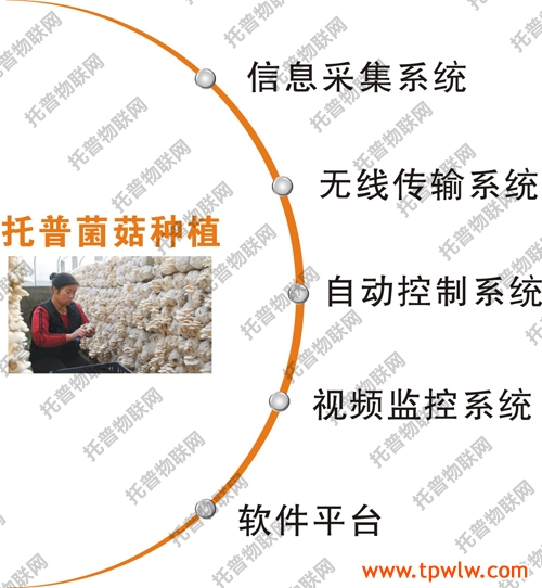托普菌菇種植包括五大系統(tǒng):1.信息采集系統(tǒng)—可采集空氣溫濕度、土壤溫濕度、光照強度、二氧化碳強度等參數(shù);2.無線傳輸系統(tǒng)—可遠程無線傳輸數(shù)據(jù);3.自動控制系統(tǒng)—包括噴灌、卷簾、風(fēng)機、加熱、補光等,達到作物適合生長環(huán)境;4.視頻監(jiān)控系統(tǒng)—查看作物實時生長情況、病蟲害防治和自動監(jiān)控功能;5.軟件平臺---遠程數(shù)據(jù)實時查看參數(shù)和自動控制功能,各類報警功能等。