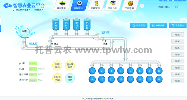 寧夏利通區農技中心于2016年引進了托普云農水肥一體化智能監控系統,整個系統可根據田間傳感器監測的土壤水分、作物種類的需肥規律,設置周期性水肥計劃實施輪灌。施肥機按照用戶設定的配方、灌溉過程參數自動控制灌溉量、吸肥量、肥液濃度、酸堿度等參數,管理人員只要通過電腦或手機APP就可進行遠程智能化管理,保障滴灌系統高效運行。實現對灌溉、施肥的定時、定量控制,從而改善土壤環境,提高水肥利用率,實現節水節肥,進一步節省人力、物力和財力,是節水農業的示范基地。