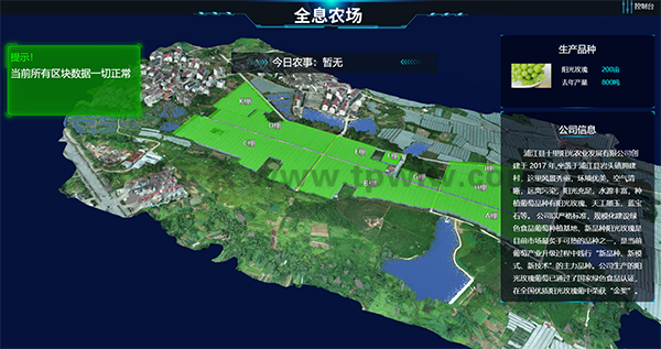 作為智慧農業的升級版本,“超級農場”項目對生產經營管理等每一個環節,都進行了嚴格的監管,數據采集,實時監測。通過無人機的航拍,實現了對整個農場的3D建模,把整個農場分成A—K,差不多11個區塊,然后進行區塊的數字化監控。一塊電子顯示屏就可看到農場的所有狀況,葡萄園11個鋼架大棚所有環境信息,包括溫度、濕度、土壤酸堿值、光照等情況都呈現在屏幕上。另外,葡萄園里各處分布了多少攝像頭,有多少在職人員,多少外來人員,也都能一目了然。