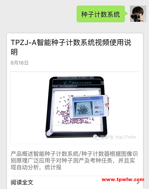 現在只需關注“浙江托普云農科技股份有限公司”的微信公眾號,回復對應的關鍵字,即可查看儀器操作視頻,比如需要查看智能種子技術系統(tǒng)的操作視頻,只需要回復“種子計數系統(tǒng)”或者儀器型號即可了解如何使用儀器,查看儀器的相關參數和功能。