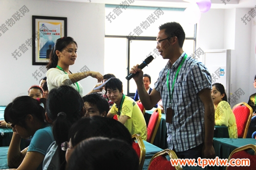 包粽子比賽之前,主持人準備了一系列知識問答,回答正確的選手,會得到小小的禮物作為獎勵,回答錯誤的選手,則要受到小小的懲罰。在知識問答環(huán)節(jié)中,大家積極舉手搶答,答對了一人拿獎一人開心,答錯了接受“懲罰”,表演節(jié)目大家開心。活動現(xiàn)場不時傳出陣陣歡笑聲。圖為:知識問答環(huán)節(jié)