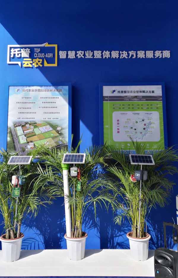 室外展區,多款產品與服務亮相新一輪科技革命和產業變革,為傳統農業向現代農業、智慧農業轉型帶來強勁動力。為做好現代農業的可視化遠程診斷、遠程控制、災變預警等智能管理,托普云農研發的智慧農業云平臺、智慧農業整體解決方案以及遠程拍照式蟲情測報燈、無線土壤墑情監測站、溫室小管家等智能硬件設備齊亮相展會現場。