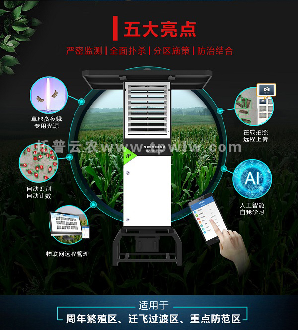 為了預(yù)防草地貪夜蛾的入侵,必須用測(cè)報(bào)燈做好監(jiān)測(cè)。托普云農(nóng)研發(fā)的智能蟲情測(cè)報(bào)燈全新升級(jí)重磅上線,具有AI人工智能自我學(xué)習(xí)功能,采用草地貪夜蛾專用光源,可自動(dòng)識(shí)別自動(dòng)計(jì)數(shù),真正做到嚴(yán)密監(jiān)測(cè),全面撲殺。在線拍照遠(yuǎn)程上傳,可通過Web或APP隨時(shí)隨地聯(lián)網(wǎng)管理。