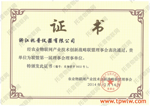 2014年6月7日,北京智慧農業物聯網產業技術創新戰略聯盟籌備成立大會暨第一次會員代表大會在北京召開。會議宣讀了決定準予《北京智慧農業物聯網產業技術創新戰略聯盟》籌備的行政批復,并經首屆理事會表決,選舉產生了第一屆聯盟組織機構,其中包括首屆聯盟主席單位,五家聯盟副主席單位,“浙江托普儀器有限公司”等八家單位當選為聯盟第一屆理事會理事單位。