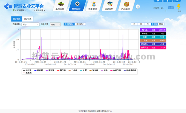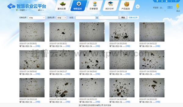 系統通過搭建在田間的智能蟲情監測設備,可以無公害誘捕殺蟲,綠色環保,同時利用GPRS/3G移動無線網路,定時采集現場圖像,自動上傳到遠端的物聯網監控服務平臺,工作人員可隨時遠程了解田間蟲情情況與變化,制定防治措施。通過系統設置或遠程設置后自動拍照將現場拍攝的圖片無線發送至監測平臺,平臺自動記錄每天采集數據,形成蟲害數據庫,可以各種圖表、列表形式展現給農業專家進行遠程診斷。可遠程隨時發布拍照指令,獲取蟲情照片,也可設置時間自動拍照上傳,通過手機、電腦即可查看,無需再下田查看。