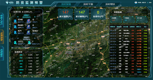 根據不同預警事件設立監測邊界、規則、算法,打通醫保、殘聯、教育等主要部門數據,運用各項數據分析低收入農戶群體,對大病支出、教育支出、受災等發起預警,及時提醒扶貧干部走訪;打通掌上應用走訪數據,實現實時跟蹤幫扶情況。